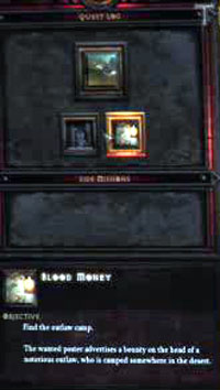 In the 2009 build, the main quest was to find Alcarnus, and that quest always showed on top of the pyramid of potential quests. Below the Alcarnus quest were two two other quests, which were different each game. There seemed to be 4 or 5 possible quests for those two slots. Below those two were four other quests, which were related to/contained within them. This third row of quests were generally the most simple, "Fed-Ex" style of quests. Players had to five stranded NPC soldiers and fight off the Lacuni that were attacking them, or locate an abandoned wagon and retrieve the treasure. These were simple, but at least there were none of the dreaded, "Go fetch me 8 skins of the desert monster" type quests that RPGs such as WoW have made so infamous.