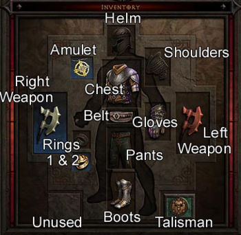 The Diablo III version of the inventory/paper doll is changed in a variety of ways. The inventory page details the improvements to the inventory and character storage space. Other differences include: