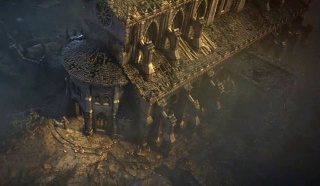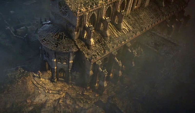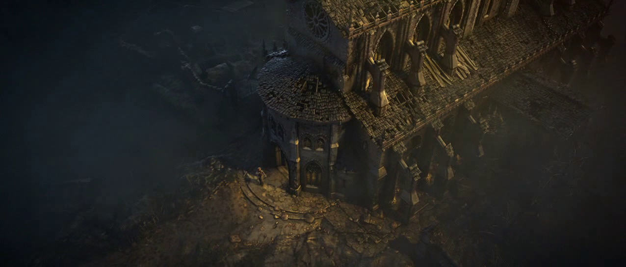 Tristram Cathedral seen from above, in the introductory cinematic.