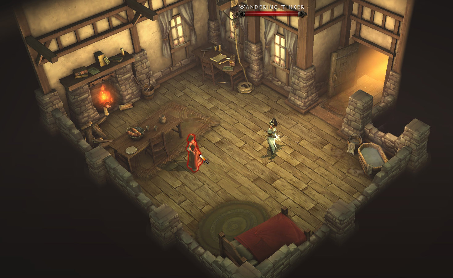 The Sheltered Cottage area is clearly labeled as the player approaches and there are a few things of interest. While the Fields of Misery, as a zone, is rather murky and always raining, the sheltered cottage has a break in the clouds above it so a shaft of light shines down upon it, which is unique to the zone. Outside of the house, there are two things of interest, being a body and a bag on the ground that the player can interact with. The building entrance leads the player into the Tinker's Hovel, which is pictured below.