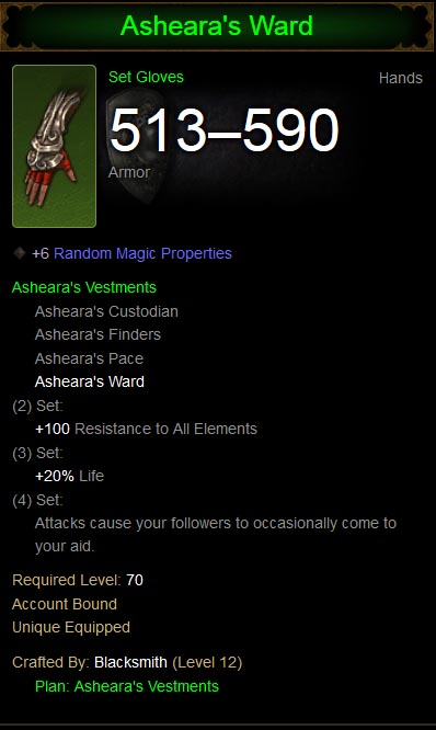 Asheara's Ward, a crafted legendary gloves set item.