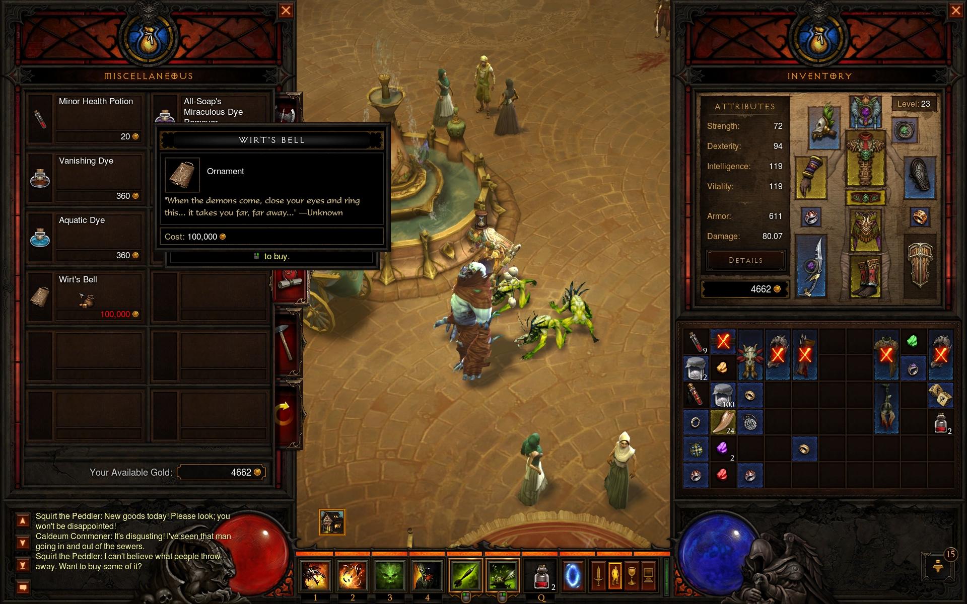Wirt's Bell for sale from Squirt, an NPC vendor in Caldeum. This is one of the ingredients required to access Whimseyshire.